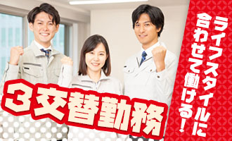 - 【1】 6:00〜14:35 【2】14:15〜22:50 【3】22:30〜7:05 ※【1】【2】【3】の3交替勤務、無理なく勤務できるよう配慮しています。